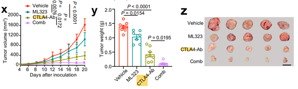 在CT26 s.c.模型的治療研究中,將CT26細胞皮下接種到BALB/c小鼠的右側(cè)脅下。癌細胞接種后三天,小鼠每天一次通過腹腔注射給予ML323(5mg/kg)。對于與5-FU的聯(lián)合治療,小鼠每天一次通過腹腔注射給予ML323(3mg/kg);或在癌細胞接種后第8、11、14天分別給予10mg/kg的5-FU;或者兩種藥物的聯(lián)合直至終點。對于與抗CTLA-4抗體(BE0164,Bio X Cell)的聯(lián)合治療,小鼠每天一次通過腹腔注射給予ML323(3mg/kg);或在癌細胞接種后第6、9、12天分別給予CTLA-4-Ab(200μg/只);或者兩種藥物的聯(lián)合直至終點。