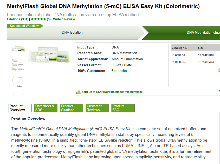 | 全局 / 總量定量(5-mC) | 基于 5mC 特異性抗體的 ELISA 檢測(cè) | MethylFlash Global DNA Methylation (5-mC) ELISA Easy Kit | P-1030提供:中文說明書 | 2 小時(shí)完成;結(jié)果與 HPLC-MS 一致性 > 95%;支持血清、細(xì)胞、組織等多樣本類型(需提取好的DNA);808+ 篇文獻(xiàn)引用(第四代升級(jí)款) | 快速判斷樣本整體甲基化水平(如腫瘤組織 vs 正常組織的 5mC 總量差異),為后續(xù)研究錨定方向 |