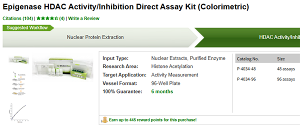 | 修飾酶活性 / 抑制分析 | 基于酶催化產(chǎn)物的比色法檢測(cè) | Epigenase HDAC Activity/Inhibition Direct Assay Kit (Colorimetric) | P-4034 | 3.5 小時(shí)完成;檢測(cè)下限 0.5ng HDAC;可用于 HDAC 抑制劑(如 SAHA)的篩選; 104+ 篇文獻(xiàn)引用 | 解析修飾變化的驅(qū)動(dòng)酶(如 HDAC6 過表達(dá)導(dǎo)致 H4K16ac 降低) |