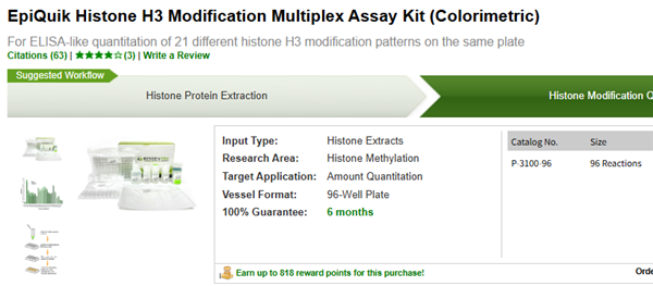 | H3組蛋白修飾全局定量 | 多重 ELISA(不同修飾位點(diǎn)的特異性抗體) | EpiQuik Histone H3 Modification Multiplex Assay Kit (Colorimetric) | P-3100 | 2.5 小時(shí)完成;同時(shí)檢測(cè) 21 種 H3 修飾(如 H3K4me3、H3K27ac);靈敏度 0.5ng/well; 62+ 篇文獻(xiàn)引用 | 一次性篩選差異修飾(如腫瘤中 H3K9me3 升高伴隨 H3K27ac 降低) |