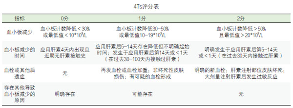 HIT 的診斷首先基于病史及臨床表現(xiàn),如既往或正在使用肝素、血小板計(jì)數(shù)明顯下降,伴或不伴血栓栓塞并發(fā)癥。目前臨床上最常用的評(píng)分系統(tǒng)是4Ts評(píng)分系統(tǒng),它是2004年由Warkentin設(shè)計(jì)。根據(jù)四個(gè)考慮因素命名的:血小板計(jì)數(shù)下降百分比、血小板減少的時(shí)間(與肝素暴露有關(guān))、血栓形成(或其他并發(fā)癥)和其他可能導(dǎo)至血小板減少的原因。各因子分值為0~2分。0~3分為低風(fēng)險(xiǎn),4~5分為中風(fēng)險(xiǎn),6~8分為高風(fēng)險(xiǎn),高風(fēng)險(xiǎn)組發(fā)展為HIT的危險(xiǎn)性概率大于80%。