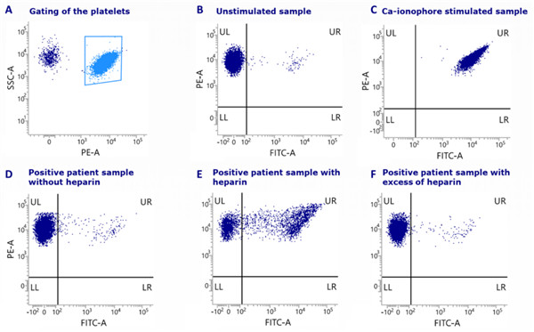 上圖:顯示每個(gè)樣本的HITAlertTM kit結(jié)果,包括對(duì)患者樣本的分析:(A)血小板的篩選;(B)未受刺激的樣本;(C)用Ca離子載體刺激的樣品;(D)沒有肝素的陽性患者樣本;(E)有肝素的陽性患者樣本;(F)肝素過量的陽性患者樣本。