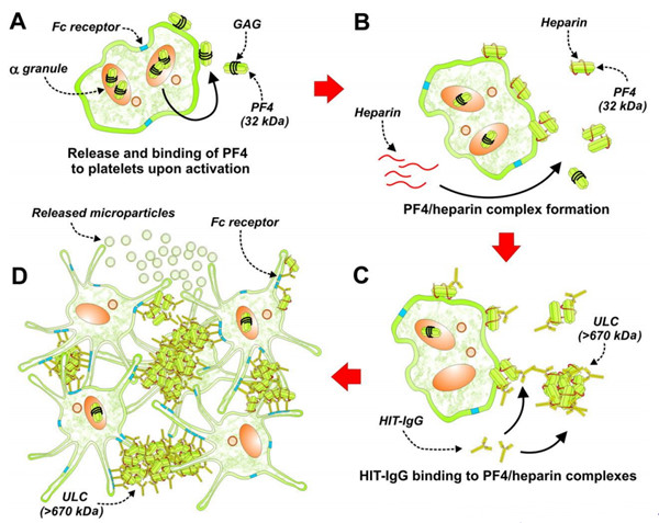 肝素誘導(dǎo)的血小板減少癥可能與免疫機(jī)制有關(guān),部分患者體內(nèi)可以出現(xiàn)一種特異性抗體IgG,該抗體可以與肝素-PF4(血小板4因子)復(fù)合物結(jié)合,PF4又稱“肝素結(jié)合陽離子蛋白”。由血小板α顆粒分泌,然后結(jié)合于血小板和內(nèi)皮細(xì)胞表面。抗體-肝素-PF4形成1個(gè)3分子復(fù)合物,再與血小板表面的Fc受體結(jié)合,免疫復(fù)合物可以激活血小板,產(chǎn)生促凝物質(zhì),是肝素誘導(dǎo)性血小板減少癥伴發(fā)血栓并發(fā)癥的可能機(jī)制。而其他藥物所致的血小板減少癥一般沒有血栓并發(fā)癥,可以作為鑒別。