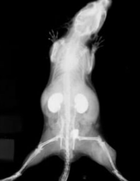| 小鼠下腔靜脈顯微CT。 | 小鼠后腿體內(nèi)x線片及注射AuroVistTM 1.9nm。右腿可見皮下腫瘤,血管金增多。 |