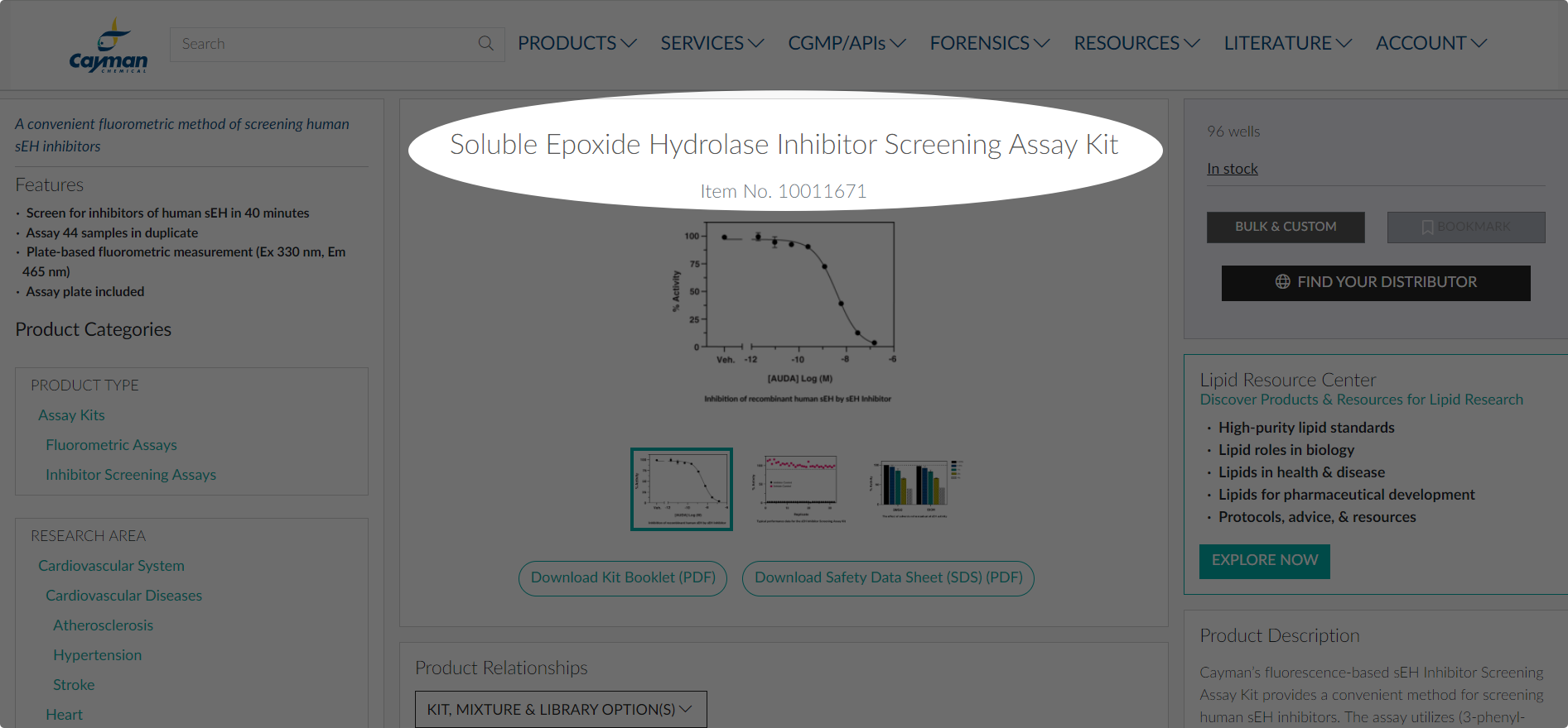 sEH的抑制被證實可同時實現(xiàn)血壓調(diào)控、器官保護(hù)與炎癥消退。而這一突破性研究的基石,正是全球頂尖實驗室共同選擇的 Cayman Chemical sEH抑制劑篩選檢測試劑盒(Cat. 10011671)。
