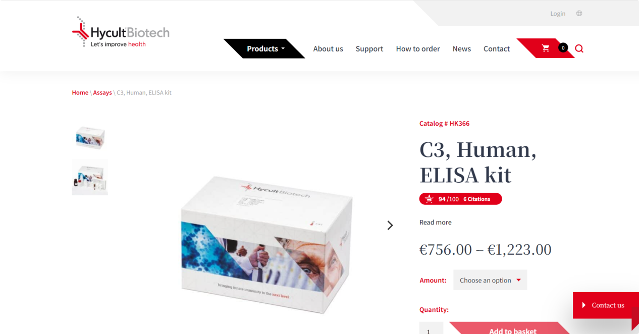 Hycult作為補(bǔ)體領(lǐng)域研究專家,可以提供高品質(zhì)的C3 ELISA試劑盒,實(shí)現(xiàn)C3的體外定量檢測: