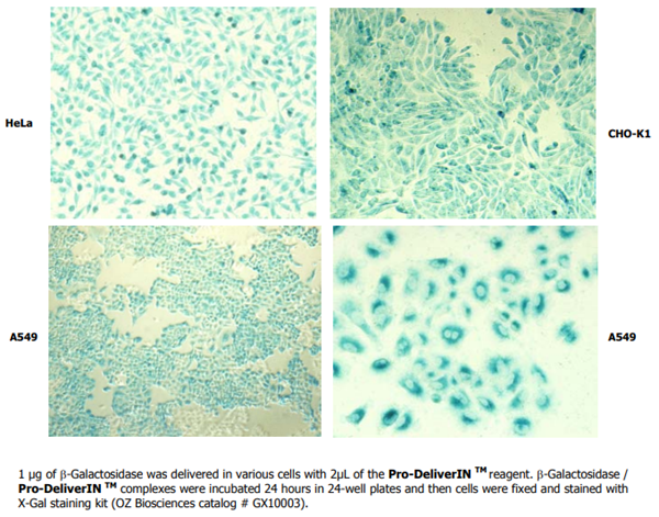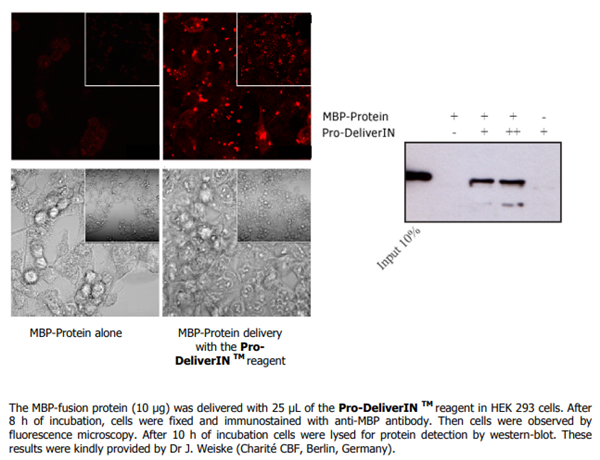 允許外源蛋白質(zhì)在活細(xì)胞內(nèi)運(yùn)輸?shù)倪f送系統(tǒng)代表了主要的研究興趣。它開(kāi)辟了新的策略,以評(píng)估蛋白質(zhì)的功能或闡明新的分子機(jī)制。Pro-DeliverIN是能夠通過(guò)靜電和疏水相互作用捕獲蛋白質(zhì)并將其遞送到細(xì)胞內(nèi)的脂質(zhì)制劑。Pro-DeliverIN適用于多種細(xì)胞類(lèi)型和多種蛋白質(zhì)。該試劑已成功地在多種永生化細(xì)胞系以及一些原代細(xì)胞上進(jìn)行了測(cè)試。如果沒(méi)有列出所用特定的細(xì)胞類(lèi)型,這并不意味著Pro-DeliverlN試劑不起作用。