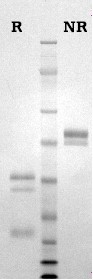 | 條帶依次為1ug(NR非還原),Marker,1ug(R還原) marker條帶從上至下為:191kDa, 97kDa, 64kDa, 51kDa, 39kDa, 28kDa, 19kDa, 14kDa | |