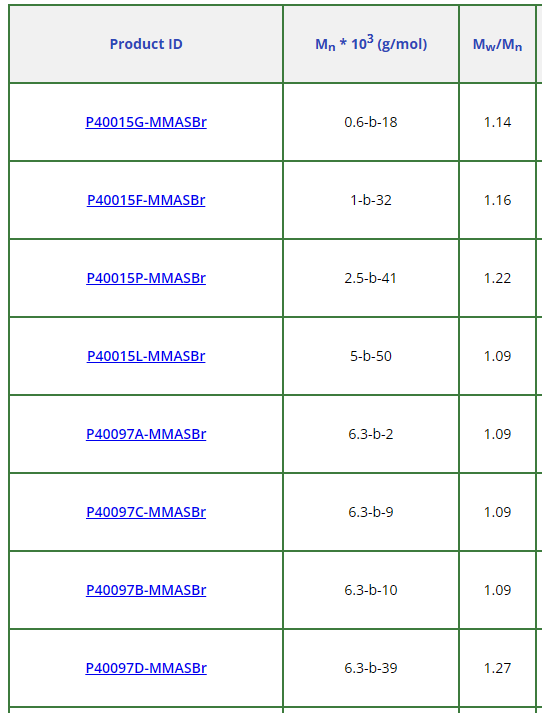 聚(甲基丙烯酸甲酯)-b-聚(苯乙烯), ω-bromo-terminated部分產(chǎn)品: