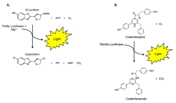 圖2:兩步螢光素酶(螢火蟲(chóng)和雷尼拉)檢測(cè)系統(tǒng)中涉及的化學(xué)反應(yīng)。