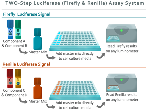 圖1:兩步螢光素酶(螢火蟲(chóng)和雷尼拉)檢測(cè)系統(tǒng)方案概述。