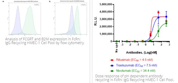 FcRn:IgG循環(huán)HMEC-1細(xì)胞池是一個(gè)表達(dá)Fcγ受體和轉(zhuǎn)運(yùn)蛋白(FCGRT)(NM_004107.5)和β-2-微球蛋白(B2M)(NM-004048.4)的HMEC-1電池池,在CMV啟動(dòng)子的控制下,由T2A自切割肽分離,通過(guò)慢病毒轉(zhuǎn)導(dǎo)引入HMEC-1細(xì)胞。該細(xì)胞池旨在測(cè)量人IgG抗體的攝取和再循環(huán)(人FcRn不結(jié)合小鼠IgG)。