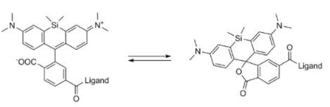 回答 3.SiR探頭被近紅外/遠紅光譜范圍內的光激發(fā)并發(fā)射光,從而避免使用通常自發(fā)熒光的較短波長,例如藍光和綠光,從而導致更高的背景信號。SiR偶聯(lián)探針具有兩種物理狀態(tài):1.非熒光閉合關閉狀態(tài)(螺內酯)和2.一個開放的、高度熒光的導通狀態(tài)(兩性離子)。探針與其配體靶標的結合有利于高熒光開放狀態(tài),而游離未結合探針處于封閉的非熒光狀態(tài)(圖3)。熒光擴增是從未結合狀態(tài)到結合狀態(tài)的100倍。這導致了高度靈敏的生物傳感器,其中大多數(shù)熒光僅以結合狀態(tài)發(fā)生(參見參考文獻3和4)。