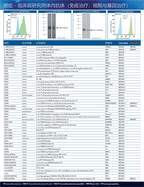 | 抗體產(chǎn)品 | 應(yīng)用 | 克隆號(hào) | InVivoMab | InVivoPlus |