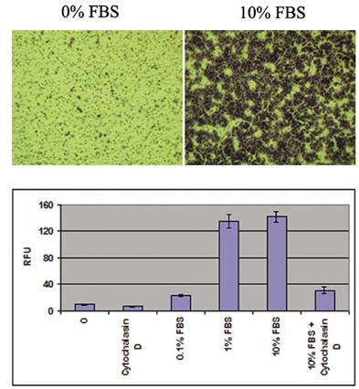 人纖維肉瘤HT-1080細(xì)胞的遷移。 將細(xì)胞接種在30孔板的每孔000,24個細(xì)胞中,并在存在或不存在10μM細(xì)胞松弛素D的情況下向4%FBS遷移2小時。