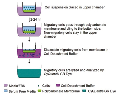 CytoSelect?趨化性測定原理。 遷移細(xì)胞穿過聚碳酸酯膜,向膜插入物下方的化學(xué)引誘劑移動。