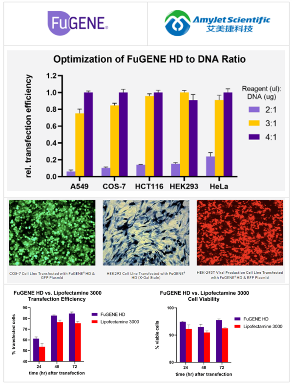 FuGENE HD的優勢:依賴于在1000多種細胞類型中證明的高轉染效率,避免耗時的優化程序,包括許多“難轉染”的細胞