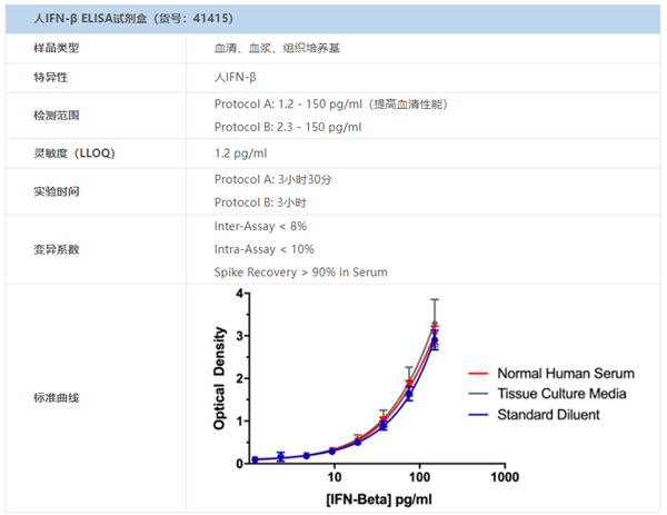 艾美捷人IFN-β ELISA試劑盒設計用于測量自身免疫性疾病血清、健康血清/血漿或組織培養基樣品中低水平或基礎水平的人IFN-β,LLOQ靈敏度為1.2 pg/ml。