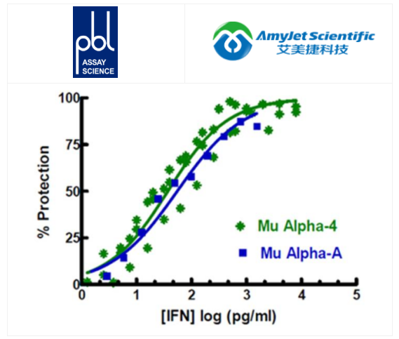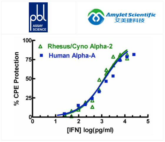 使用細胞病變效應抑制測定法對具有 VSV 的牛 (MDBK) 細胞和具有 EMCV The EC 的人 (A549) 細胞進行測量50牛 IFN 為 ~ 5 U/ml EC50對于人 IFN 為 ~ 1 U/ml。