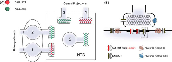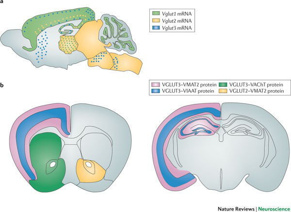 囊泡谷氨酸轉(zhuǎn)運(yùn)體(vesicular glutamate transporters,VGLUTs)能特異地裝載谷氨酸進(jìn)入突觸囊泡并促進(jìn)釋放,它包括3個(gè)成員,其中VGLUT1和VGLUT2是谷氨酸能神經(jīng)元和它們軸突末端高度特異的標(biāo)志,同時(shí)VGLUT1標(biāo)志著皮質(zhì)-皮質(zhì)投射,VGLUT2標(biāo)志著丘腦-皮層投射。而VGLUT3則會(huì)出現(xiàn)在膽堿能中間神經(jīng)元、5-羥色胺能神經(jīng)元、海馬和皮層中GABA能中間神經(jīng)元中。VGLUTs的異常會(huì)導(dǎo)致興奮性神經(jīng)遞質(zhì)谷氨酸的異常,從而誘發(fā)多種神經(jīng)系統(tǒng)疾病。
