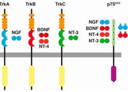 神經(jīng)營養(yǎng)因子受體是一組與神經(jīng)營養(yǎng)因子特異性結(jié)合的生長因子受體。已發(fā)現(xiàn)的與神經(jīng)營養(yǎng)因子對應(yīng)的受體有酪氨酸激酶受體的“ Trk”家族和p75NTR。p75NTR是一種低親和力的神經(jīng)營養(yǎng)因子受體,所有神經(jīng)營養(yǎng)因子都與之結(jié)合。它是腫瘤壞死超家族的成員。Trk家族包括TrkA,TrkB和TrkC,并且只與特定的神經(jīng)營養(yǎng)因子結(jié)合,但有更高的親和力。Trks介導(dǎo)神經(jīng)營養(yǎng)因子的功能信號。