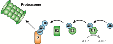 泛素一蛋白酶體途徑(ubiquitin-proteasome pathway)是細(xì)胞內(nèi)一個重要的蛋白質(zhì)降解調(diào)節(jié)系統(tǒng)。通過對底物蛋白的多聚泛素化并經(jīng)蛋白酶體降解,可以影響或調(diào)節(jié)多種細(xì)胞活動,包括:基因轉(zhuǎn)錄、細(xì)胞周期調(diào)節(jié)、免疫反應(yīng)、細(xì)胞受體功能及腫瘤生長、炎癥過程等。該途徑也是一種動態(tài)的蛋白質(zhì)雙向修飾調(diào)控系統(tǒng),在體內(nèi)由泛素連接酶系統(tǒng)(E1-E2-E3)對底物進(jìn)行泛素化修飾,去泛素化酶(DUB)家族負(fù)責(zé)通過水解泛素羧基末端的酯鍵、肽鍵或異肽鍵,將泛素分子特異性的從鏈接有泛素的蛋白質(zhì)或者前體蛋白水解下來,起到去泛