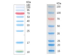 品質(zhì)與性價比齊飛的Abbkine-彩虹預(yù)染蛋白質(zhì)Marker產(chǎn)品,不僅可以用于直觀地監(jiān)測SDS-PAGE電泳的進程,評估PVDF、尼龍和硝酸纖維素膜的轉(zhuǎn)移效率、還可以用于計量蛋白質(zhì)的大致分子量。