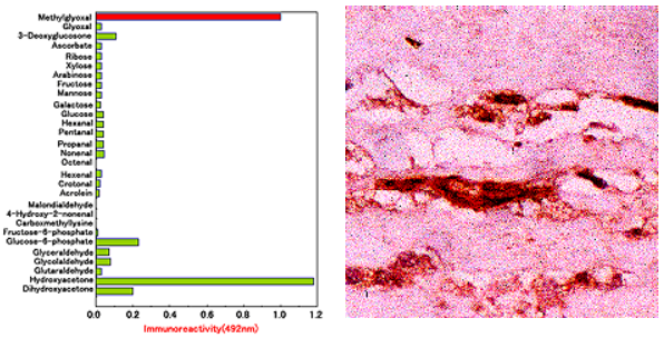甲基乙二醛(MG)是一種內(nèi)源性代謝產(chǎn)物,在糖尿病中含量增加,也是美拉德反應(yīng)(糖化反應(yīng))中的一個(gè)常見中間體。MG能夠與蛋白質(zhì)發(fā)生反應(yīng),形成晚期糖基化終末產(chǎn)物(AGE)。MG與蛋白質(zhì)中的精氨