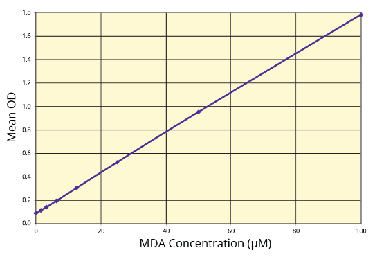 脂質(zhì)過氧化是植物和動物細胞損傷的既定機制,用作細胞和組織中氧化應(yīng)激的指標。源自多不飽和脂肪酸的脂質(zhì)過氧化產(chǎn)物是穩(wěn)定的,并分解形成多種化合物混合物,包括MDA。 在該反應(yīng)中形成的MDA-TBA加合物是粉紅色的,可以在?= 532nm處讀取。530–545 nm 之間的測量是可以接受的。