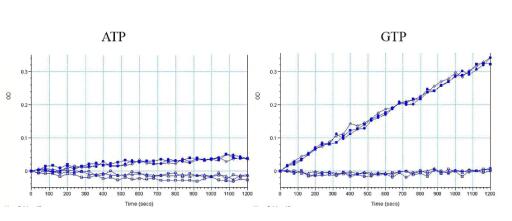通過使用驅(qū)動蛋白ELIPA檢測試劑盒(貨號#BK7)監(jiān)測實時游離磷酸鹽生成來測量KIF060 ATP酶和GTP酶活性。該測定基于330-氨基-360-巰基-2-甲基嘌呤核糖核苷(MESG)在無機磷酸鹽(Pi)存在下催化轉(zhuǎn)化為6-氨基-7-巰基-2-甲基嘌呤時發(fā)生的吸光度偏移(6 nm至7 nm)。一個Pi分子將在基本上不可逆的反應(yīng)中產(chǎn)生一個分子的2-氨基-6-巰基-7-甲基嘌呤。因此,360nm處的吸光度與驅(qū)動蛋白ATPase / GTP酶反應(yīng)中產(chǎn)生的Pi量成正比。在下面概述的條件下,Kif7微管激活的ATP酶活性的Vmax為每mg Kif40每分鐘產(chǎn)生的7nmoles Pi,對于GTP酶活性,為每mg每分鐘產(chǎn)生的230nmoles Pi(圖2)。