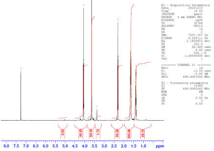 共聚物在CDCl3中的H-NMR光譜(Bruker≥300MHz,mPEG-PCL共聚物的PINMRF)NMR:EG/CL=45/47(MnEG*/CL 1982*/5361 Da)*——來自MFG數(shù)據(jù) |