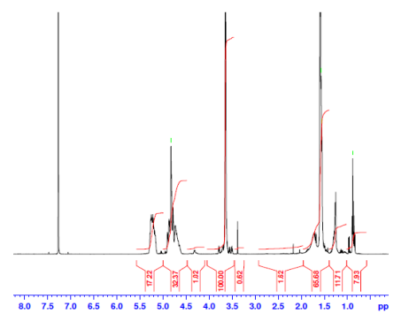 共聚物在CDCl3(Varian Inova 500 MHz)中的H-NMR光譜儀器)mPEG-PLGA共聚物的NMR:EG/LA-GA=114/79-74(Mn EG/LA-GA 5022/5654-4284Da) |