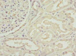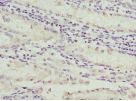 | 使用PACO44862以1:100的稀釋度對石蠟包埋的人胃癌進行免疫組織化學。 | 使用 PACO44862 以 1:100 的稀釋度對石蠟包埋的人腎臟組織進行免疫組織化學。 |