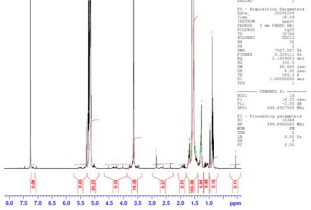 共聚物在CDCl3(Bruker≥300MHz,PLGA共聚物的PINMRF)NMR:EG/LA=109/721(Mn乙二醇:LA 4802*:51914 Da) |