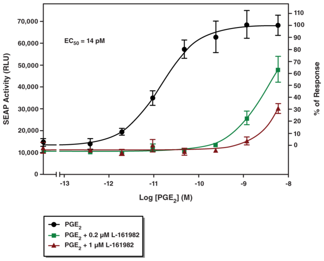 前列腺素E2(Prostaglandin E2 Receptor, PGE2)是花生四烯酸在很多細(xì)胞中代謝的主要產(chǎn)物。跟很多類花生酸一樣,PGE2不會(huì)預(yù)先存在于細(xì)胞中。當(dāng)細(xì)胞活化或是存在外源的花生四烯酸時(shí),PGE2合成并釋放到胞外。前列腺素E2受體(EP)是一類G蛋白偶聯(lián)受體,PGE2的作用依賴于細(xì)胞上表達(dá)的具有不同功能的PGE2受體EP亞型的激活。