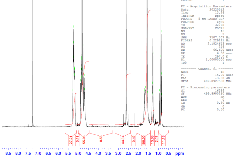 共聚物在CDCl3中的H-NMR光譜(Bruker≥300MHz,PINMRF)PLGA共聚物的NMR:LA-GA=50%-50%摩爾比率(LA:GA 55%-45%Da) |