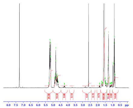 共聚物在CDCl3中的H-NMR光譜(Bruker 500MHz,PINMRF)PLGA共聚物的NMR:LA-GA=74%-26%摩爾比率(LA:GA 78%-22%w-w) |