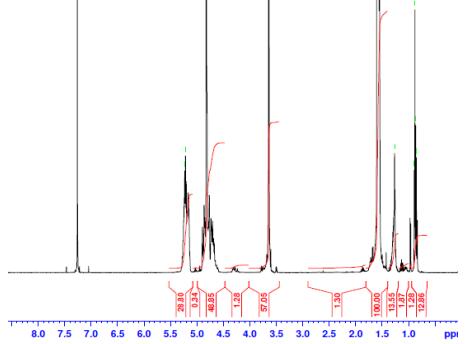 CDCl3(Varian Inova 500 MHz)中共聚物的H-NMR譜儀器)PLGA-PEG-COOH重復(fù)單元的NMR:EG-LA/GA=79*-160/135(錳=3480*-11486/7852 Da) |