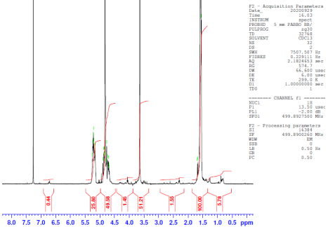 共聚物在CDCl3中的H-NMR光譜(Bruker≥300MHz,PINMRF)PLGA-PEG共聚物的NMR:EG/LA-GA=107/216-207(錳EG/LA:GA 4714/15525:1025Da) |
