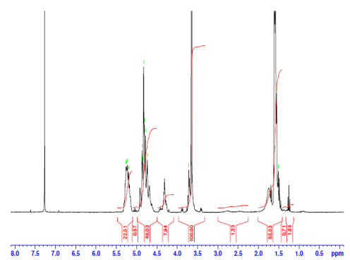 PLGA-PEG-PLGA共聚物的核磁共振氫譜CDCl3(Varian Inova 300 MHz儀器)PLGA共聚物重復(fù)單元:EG-LA/GA:25*-22/24,Mn:EG-LA/GA:1101*-1621/1423 |