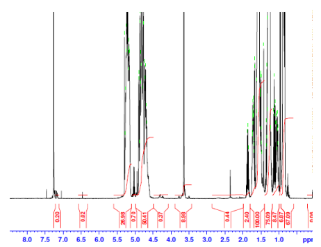 共聚物在CDCl3(Varian Inova 500 MHz)中的H-NMR光譜儀器)PLGA-PEG-PLGA重復(fù)單元的NMR::EG-LA/GA=103-1238/1156(錳HNMR 4537*-89124/67117) |