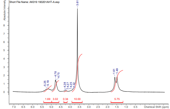 CDCl3(NMReady 60e)中共聚物的H-NMR光譜Nanalysis,60 MHz儀器)PLGA-PEG-PLGA的NMR共聚物:EG/LA-GA=34*/23-21(Mn EG-LA:GA 1498*-1655:1192) |