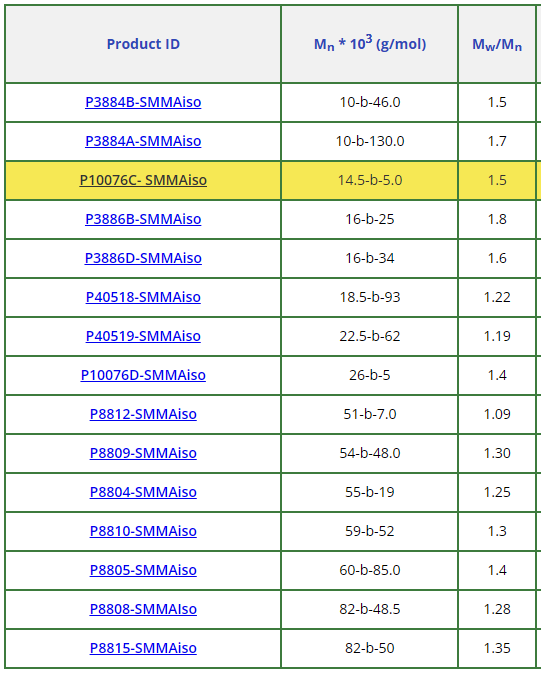 | 聚(苯乙烯)-b-聚(甲基丙烯酸甲酯), PMMA block is isotactic (>90%) | PMS-P10076C- SMMAiso-500mg | 查看 |