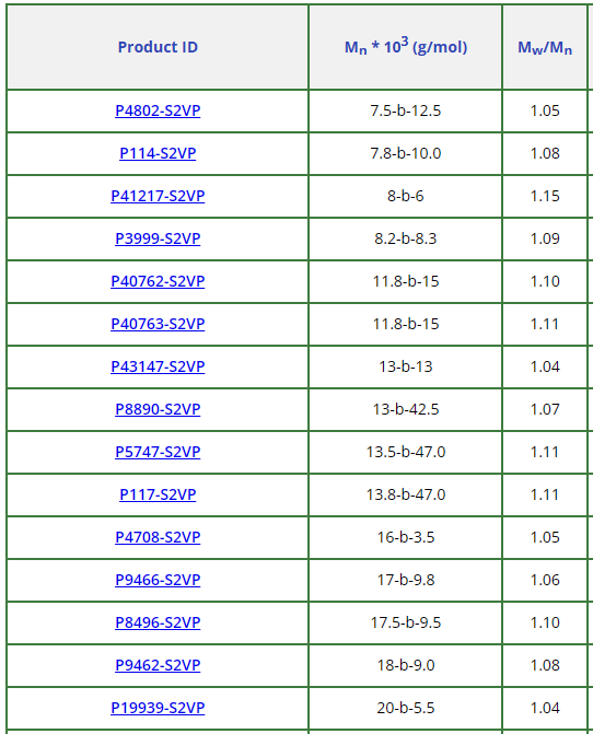 聚(苯乙烯)-b-聚(2-乙烯基吡啶)部分產(chǎn)品:
