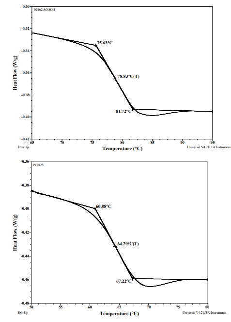 聚苯乙烯(PS)和羧基封端聚苯乙烯之間的玻璃化轉(zhuǎn)變溫度(Tg)(PSCOOH)在10℃/分鐘的加熱速率下比較兩者的Mn均為2000。已經(jīng)發(fā)現(xiàn)PSCOOH的Tg比相應(yīng)的PS(64℃)高15℃(79℃)。兩個樣品的溫度計圖如下所示: