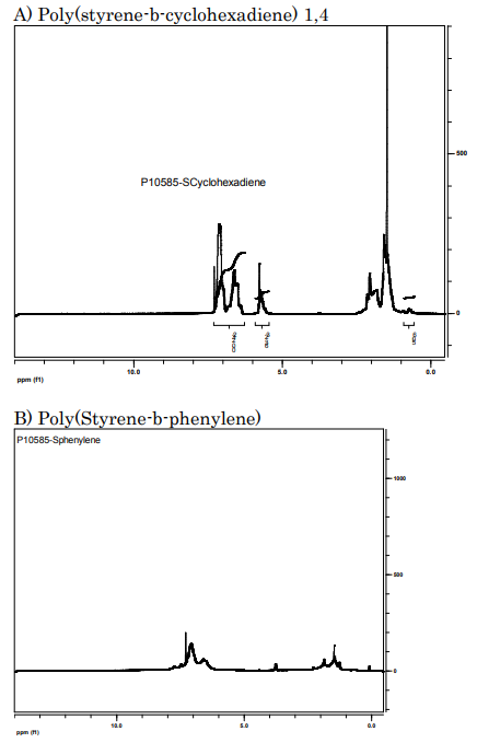 陰離子聚苯乙烯嵌段的等分試樣為在加入環(huán)己二烯之前終止,以及通過尺寸排阻色譜法(SEC)進行分析獲得分子量和多分散指數(shù)(PDI)。然后將嵌段共聚物組合物通過比較1H-NMR光譜計算乙烯基二烯質(zhì)子在5.7ppm處的峰面積聚苯乙烯的芳香質(zhì)子為6.3-7.2ppm。共聚物PDI由SEC測定核磁共振證實了環(huán)己烯的芳構(gòu)化作用峰值在5.7ppm處消失。樣品的熱分析使用差示掃描量熱計(TA Q100),加熱速率為10oC/分鐘。拐點玻璃化轉(zhuǎn)變溫度(Tg)已被考慮。