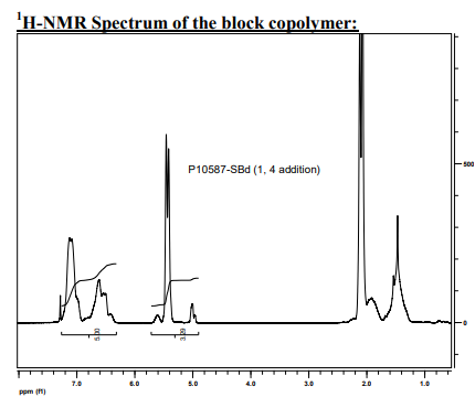 終止等分的陰離子聚苯乙烯嵌段添加丁二烯之前,并通過尺寸排除進行分析色譜法(SEC)以獲得分子量和多分散指數(shù)(PDI)。最終的嵌段共聚物組成由通過比較聚丁二烯質(zhì)子(雙鍵4.9-5.6ppm)與聚苯乙烯的芳香質(zhì)子為6.3-7.2ppm。1小時-分鐘光譜分析表明共聚物主要含有1,4-添加丁二烯微觀結(jié)構(gòu)(>90%)(約5.30-5.65ppm),其中1,2-加成丁二烯的貢獻很小(約5.00ppm)。共聚物PDI由SEC測定。
