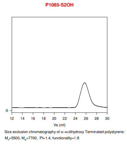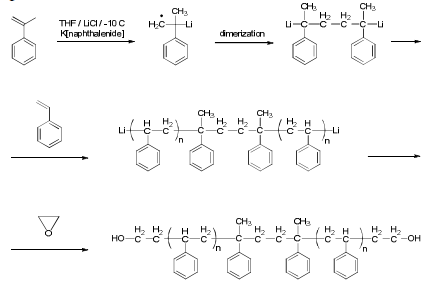 合成程序:α、 制備了ω-二(羥基)封端的聚苯乙烯通過(guò)使用活性陰離子聚合苯乙烯THF中的雙官能引發(fā)劑,然后終止使用環(huán)氧乙烷。反應(yīng)方案為如下所示:
