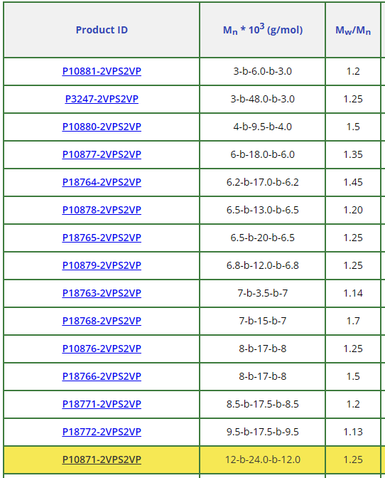 聚(2-乙烯基吡啶)-b-聚(苯乙烯)-b-聚(2-乙烯基吡啶)產(chǎn)品: