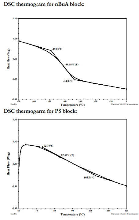 熱分析: 樣品的熱分析是在TA Q100加熱差示掃描量熱計(jì)速率為10oC/min第二次加熱掃描的熱流圖為被認(rèn)為是玻璃化轉(zhuǎn)變溫度(Tg)。